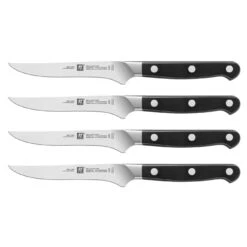 Sættet med fire steakknive fra ZWILLING består af slidstærke kvalitetsknive. De kan anvendes til at skære for eksempel en saftig steak direkte fra stegepanden eller en marineret bøf lige fra grillen. Knivene skærer let og ubesværet igennem velsmagende grillede bøffer og andre stegte råvarer. Det klassiske tre-nittede design giver et attraktivt look. Takket være deres tolags V-Edge giver disse knive fremragende og langvarige skæreegenskaber, såvel som optimal skarphed. Materialet er neutralt i smag og korrosionsbestandigt. Disse stødsikre knive er utrolig slidstærke og robuste. Takket være de skarpe blade vil du altid have den rette kniv lige ved hånden.